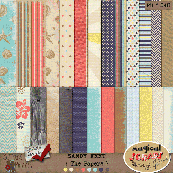 Marina of Magical Scraps Galore has released a new kit, Sandy Feet. This kit is perfect to scrap your summer memories and beach layouts, whether you’re building sand castles, surfing the waves or just relaxing under the sun.